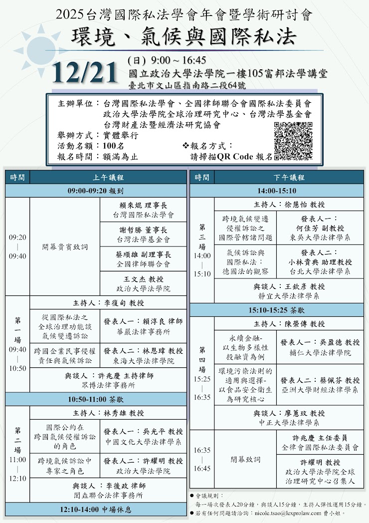 主辦單位:台灣國際私法學會、全國律師聯合會國際私法委員會、政治大學法學院全球治理研究中心、台灣法學基金會、台灣財產法暨經濟法研究協會